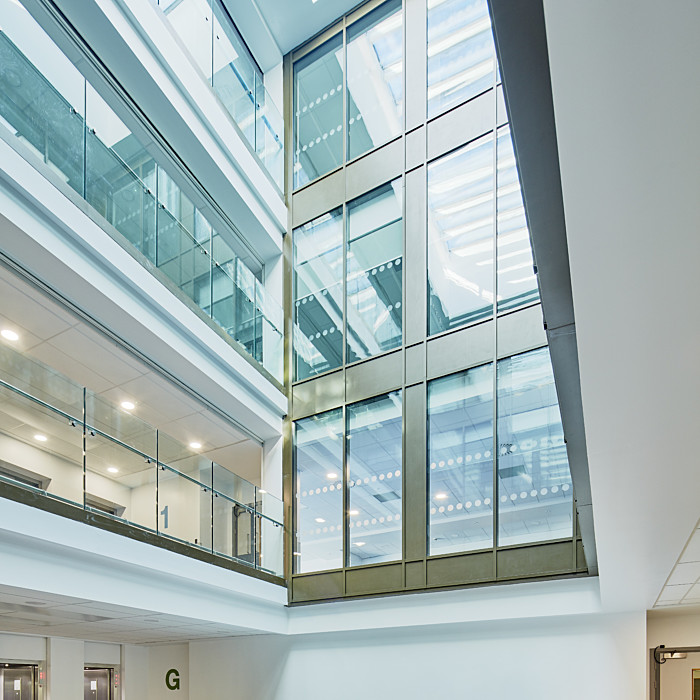Internally the building has a clean design, accented with bright colours designating the different floors.