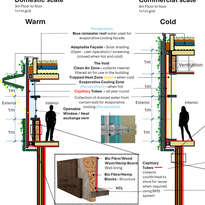 The façade solution comprises of a glazed or solid inner skin with an adaptable, flexible, movable outer skin. The void between the twin skins traps heat in cold conditions, Just like the hairs on our skin, and uses evaporative cooling in hot conditions, mimicking perspiration. Capillary tubes inside the void transfer this energy around the building storing the energy for use at other times, similar to capillaries and veins carrying heat in blood around our body. The outer façade filters the incoming air into the void and this clean air is used inside the building.