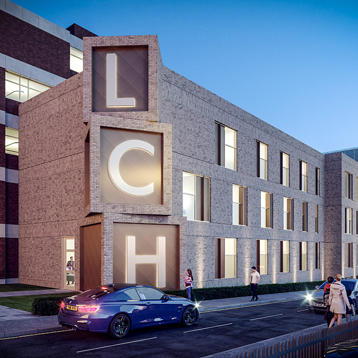 The design concept is based on alphabet building blocks on a prominent corner of the Kensington Building extension. Lit dramatically with a halo effect, the letters create an iconic face to the new hospital - a landmark identity, befitting the state-of-the-art treatment within.