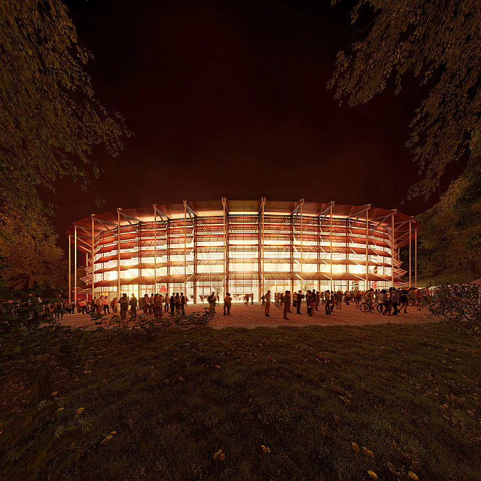 The proposals for the new stadium would establish a close dialogue with the magnificent natural setting of the forest, with a unique façade concept ‘the cone in the clearing of the forest’ inspired by the leaves of the trees around it. Respecting the cultural heritage of Aarhus Sports Park, the exterior of the building would have heritage red-tone colours while the interior canvas was designed white to act as a canvas for the action at the stadium while allowing for an improved shelter and microclimate.