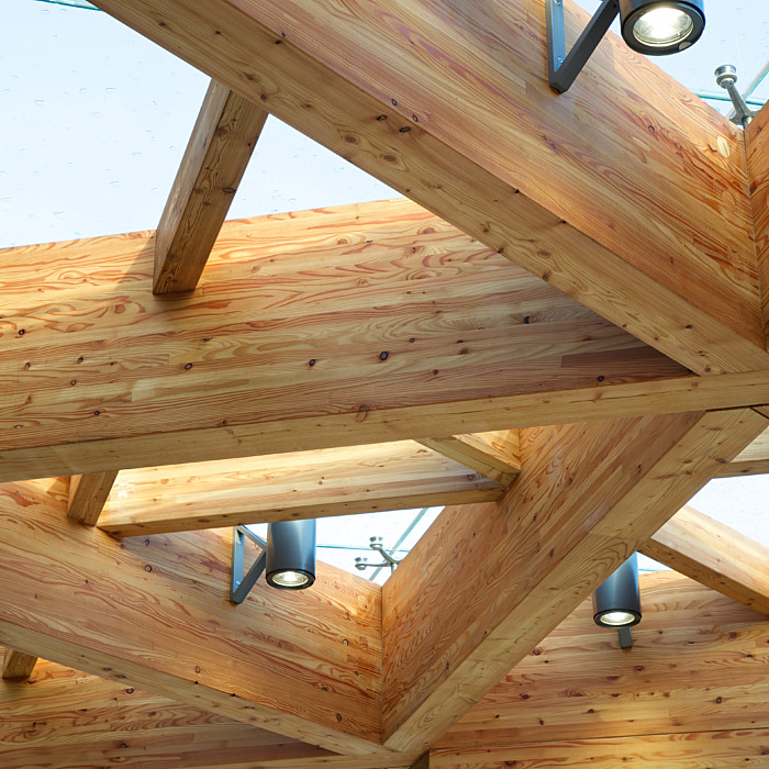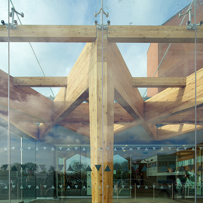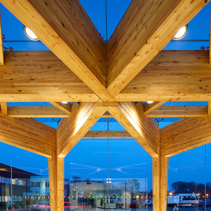 Ultimately this was achieved; the dark cladding panels give a stark contrast to the glulam’s natural tones, framing the structure and emphasising its form.