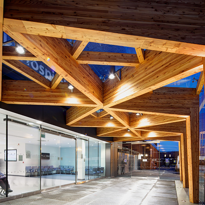 The enveloping frameless glass system maximises natural light ingress to both the entrance and reception area of the hospital, and the sculptural structure’s five primary supports naturally guide the eye skywards to the interlocking hexagonal arrangement of the roof.