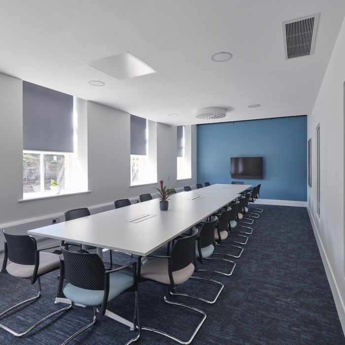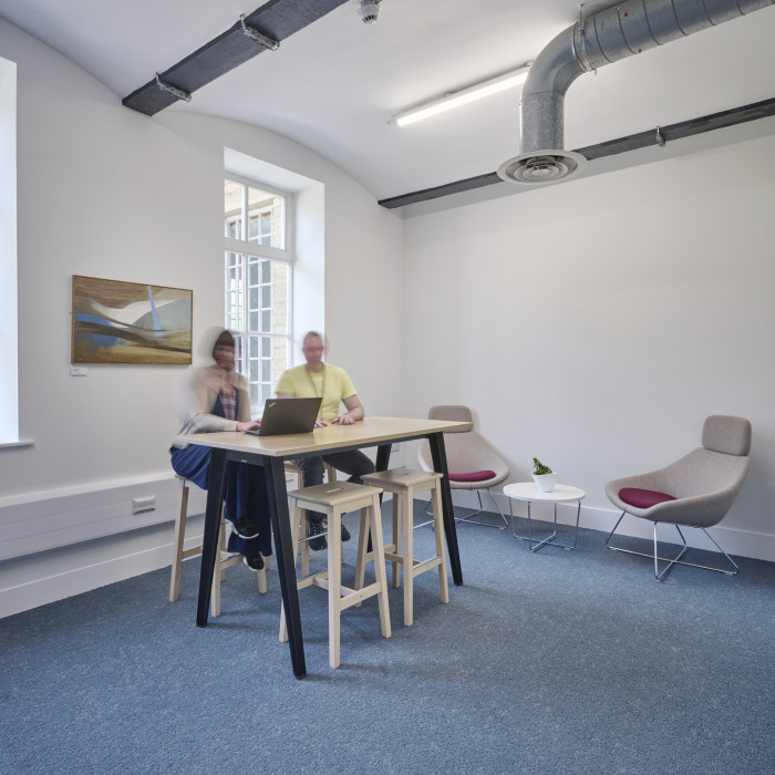 Key architectural features such as stone walls, timber beams, vaulted ceilings, and cast iron columns were retained and celebrated within the design. Layouts were developed with these features in mind, avoiding clashes and making use of the building’s existing rhythm to inform spatial organisation. The environment had to support quiet focus, teamwork, and informal collaboration, all within an efficient, cost-sensitive footprint that allowed for future service expansion.