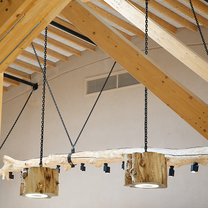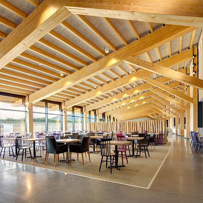The main building, which has been designed with the aim to achieve BREEAM Excellent rating, is constructed with timber and local stone and features an arched grass covered roof.