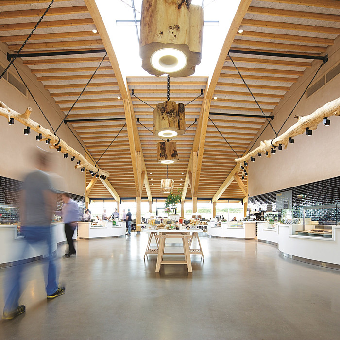 The site includes extensive landscaping along with electrical vehicle charging stations, a wildflower seeded roof and capacity to switch to bio-fuel pumps. It also features a famous onsite farm shop, which is stocked with local produce, and replaces the more traditional fast food outlets normally found at motorway service stations.