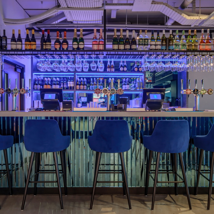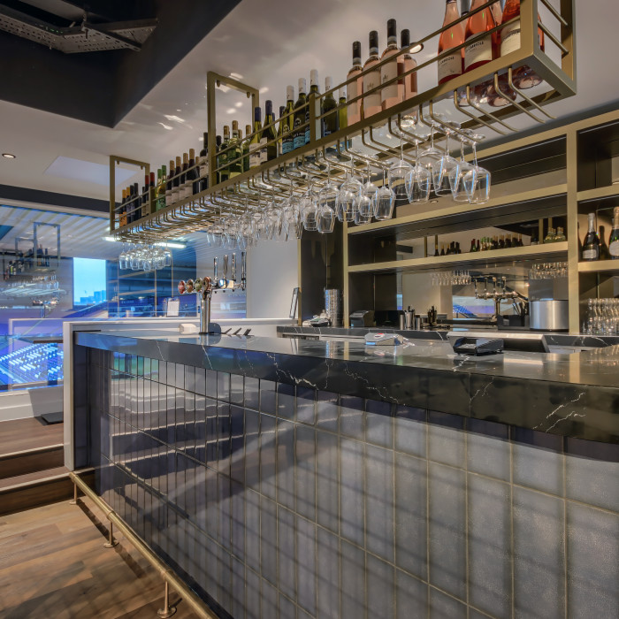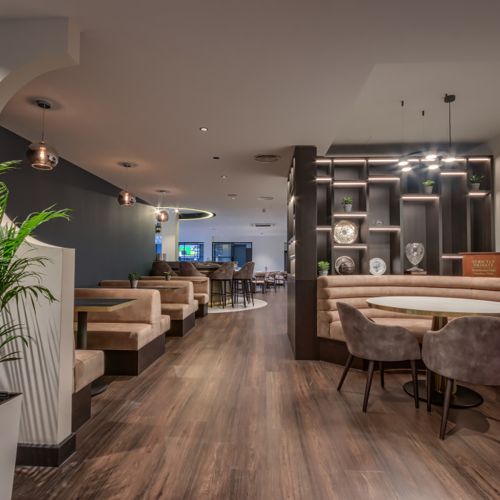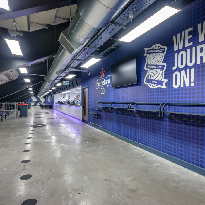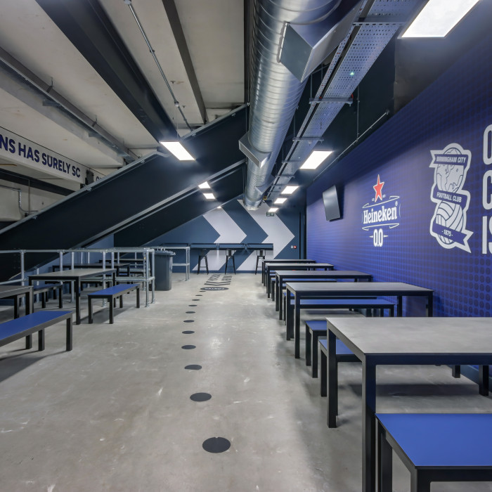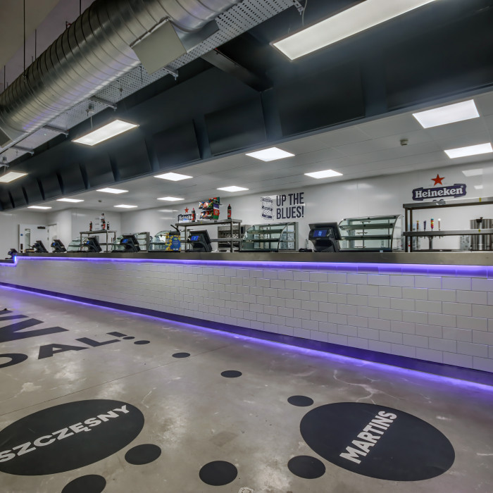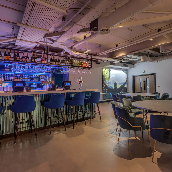 Featuring a long, open concourse with a central bar equipped with 13 till points for swift service, Box2Box accommodates hundreds of fans. Bespoke seating areas and a stage for live entertainment contribute to the lively atmosphere, while the transformation provides a new revenue stream for the club. This upgrade has successfully enhanced the matchday experience, making it a central gathering point for supporters.